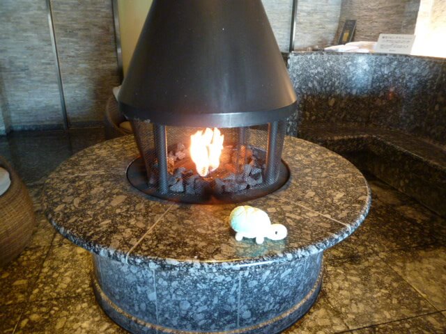 内湯の中ですが、まるでリビングのような暖炉があります。