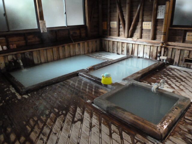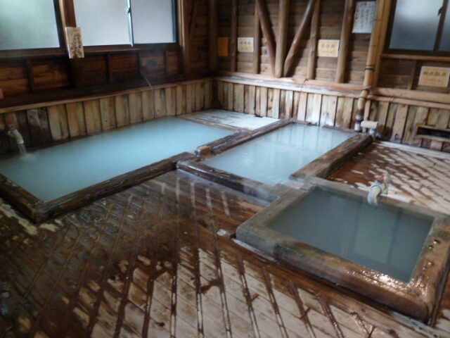 源泉かけ流しのぬる湯、熱い湯の温度差がある浴槽が3つ並び